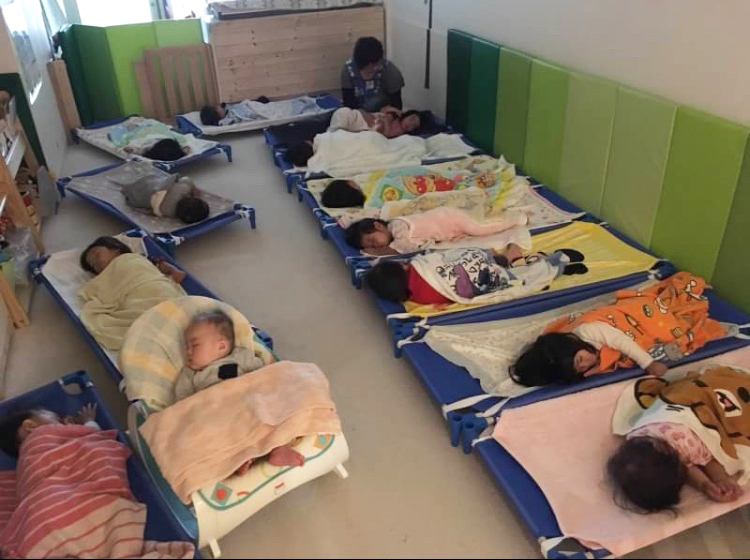 お昼寝朝から元気いっぱいに過ごした子ども達。体の疲れをとりましょう。毎日、決まった時間に昼寝をすることで、自然と生活リズムも身に付いていきます。